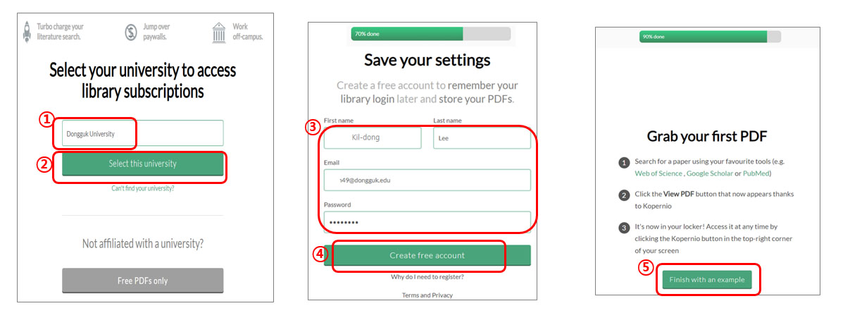 다. ①Dongguk University 입력 후 - ② Select this university 클릭학술정보의 생성 과정 및 학술커뮤니케이션의 이해 - ③인적사항 입력 후 – ④Create free account 클릭 - ⑤ Finish with and example 클릭