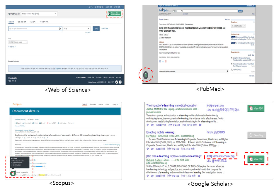 Google Scholar, Web of Science, Scopus, pubmed 플랫폼에서 원문이 가능한 전자저널 원문을 연결해 주는 프로그램