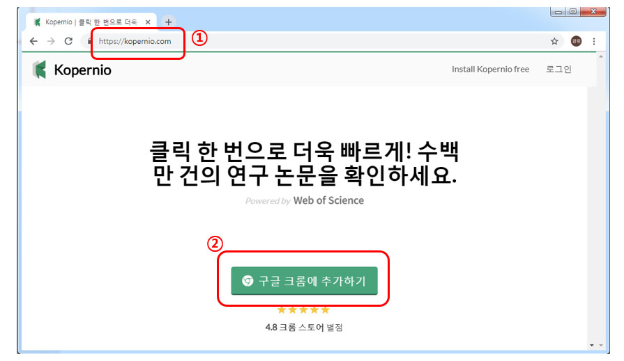 가. Google Chrome 구동 – ①주소창에 https://kopernio.com/ 입력 – ②Google Chrome에 추가하기 클릭