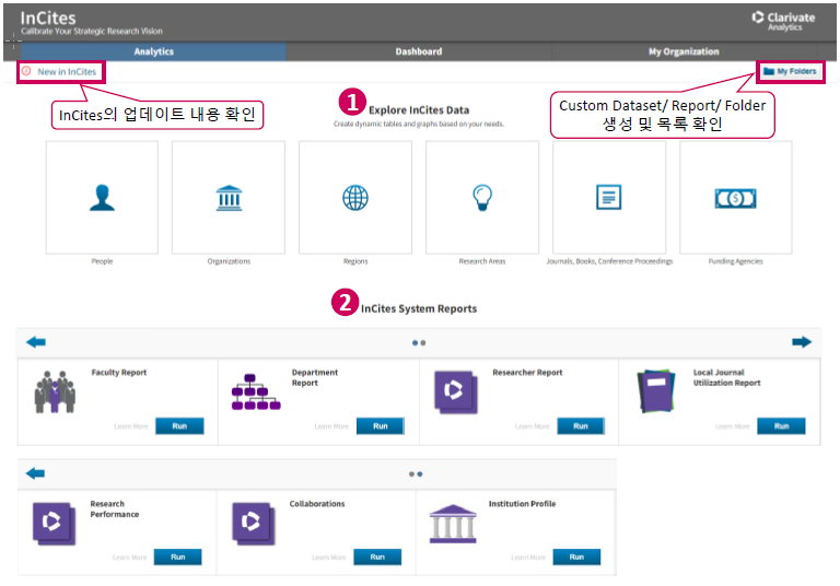 3. InCites B&A 기본 화면 구성은 다음과 같습니다.